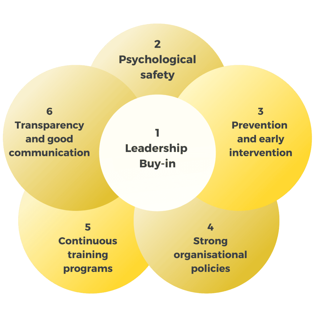 1Leadership buy-in. Media executives and managers who understand that their staff’s mental health and overall welfare must be a priority and are prepared to invest time and resources to achieve it. An organization’s leadership that understands they set the tone and therefore consciously model healthy workplace practices.